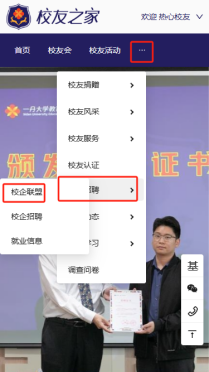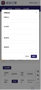 校企认证通过的校友企业,可以发布招聘信息。在校友空间,点击“发布招聘”,填写表单后,可以提交招聘信息。校友企业的招聘信息会在首页-校企招聘栏目-校企招聘子栏目中展示。