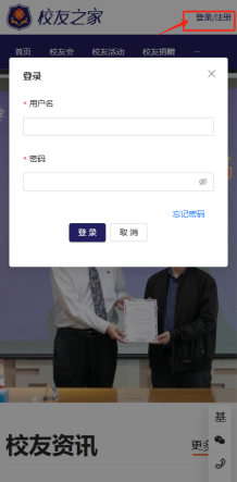 校友直接点击右上角登录按钮,进行登录;未认证的校友先点击注册进行校友认证,待认证通过后登录校友之家。