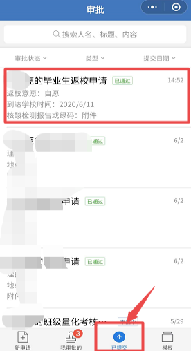 3.提交后等待辅导员审批,同时可以在【已提交】中查看审批的状态。