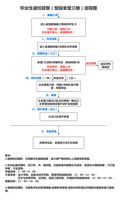 5.食堂就餐管理。就餐时,食堂按照价格标准打包学生自取,请同学们分开就餐、错峰就餐,进食堂排队隔离1米以上。食堂不设堂食,详见就餐流程图: