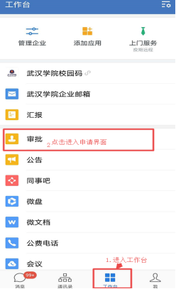 1.打开企业微信,进入【工作台】,打开【审批】功能。