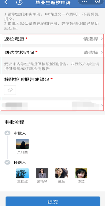 2.点击【毕业生返校申请】,进入申请页面后,按要求如实填写,审批人已经默认为自己的辅导员,若不是请让辅导员协助处理,抄送人员不用管,然后提交,申请流程就结束了。提交一次即可,不用反复提交。申请内容可能会有调整,到时以页面展示的为准。