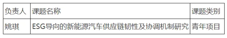供应链管理是工商管理学科的重要研究领域,供应链韧性是供应链管理中的热门研究问题。姚琪长期致力于该问题的探索与创新,她的选题以供应链的ESG管理为出发点,研究ESG目标导向下能够提升新能源汽车供应链韧性的协调机制,研究视角新颖,创新性强,是面向经济社会发展需要和国家需求背后的基础科学问题,获得评审专家认可。