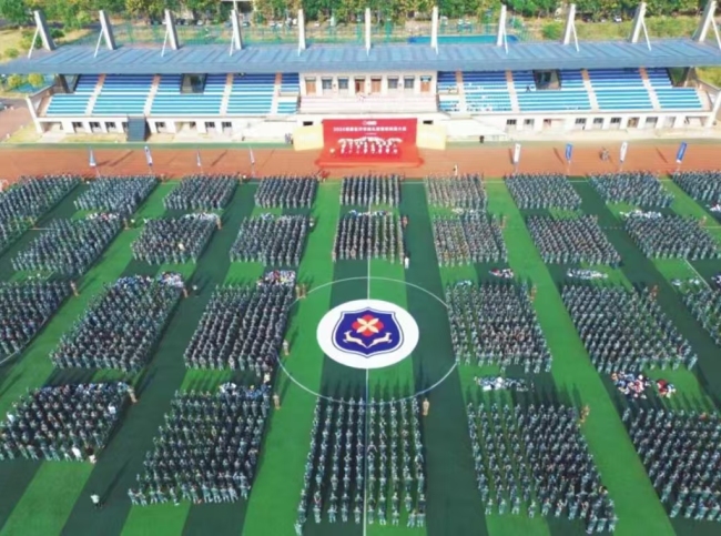 “让勤奋学习成为青春远航的动力,让增长本领成为青春搏击的能量!”9月9日上午,beat365官方网站田径运动场国旗杆两旁,树立起习近平总书记寄语青年的巨幅标语,格外醒目。近4000名身着戎装的学子整齐列队,中间镶嵌直径10米的校徽,颇为壮观。