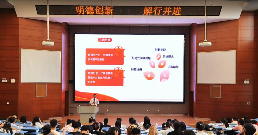 陈祖亮从习近平总书记关于新质生产力的重要论述引入,阐述新质生产力与马克思主义生产力理论基础,根据新一轮科技革命和产业变革背景下先进生产力的发展趋势和演进方向,指出当前新质生产力讨论的几大误区,带领同学们从社会主义的本质要求和高质量发展的内在要求出发,深刻领会发展新质生产力的重大意义及党中央发展新质生产力的战略意图。