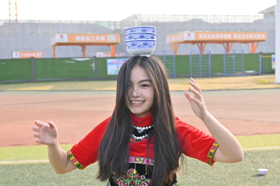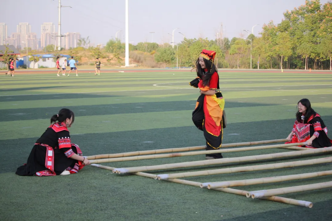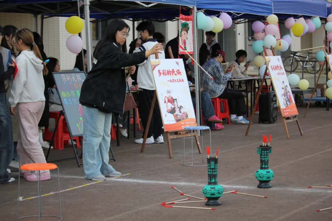“民族展示文化”活动现场,同学们体验了“竹竿舞”“抛绣球”“投壶”等民族特色活动。民族文化知识答题也是备受关注很多同学都领取了精美民族小玩具。老师们也纷纷体验了各具特色的小活动。每个人的脸上都充满了笑容,整个田径场充满了欢声笑语。