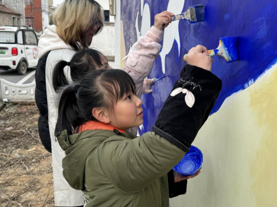 当地气温较低,志愿者一整天都在室外作画,耳朵、脸颊和双手被凛冽的寒风冻得通红,高举作画的手臂肌肉酸痛,铺在地上的防尘膜常被寒风吹起,志愿者们一次又一次耐心、细心地铺平,又仔细地将颜料桶里的灰尘、木屑等垃圾清理出来。尽管是如此艰苦的条件,志愿者们仍一丝不苟地完成每一面墙绘作品。当地热心村民看到志愿者们如此认真,向志愿者们提供了许多力所能及的帮助。同时临近寒假,周边的孩子们每天一放学就加入墙绘的队伍,在志愿者们的指导下拿起画笔描绘心中长江美景,为墙绘增添童真,让环保理念深入人心。