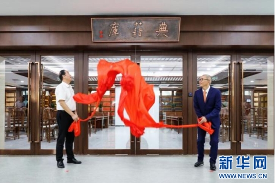 图为陈一丹(右)、李忠云为“典籍库”揭幕
