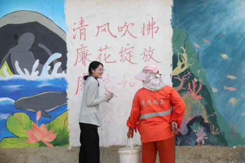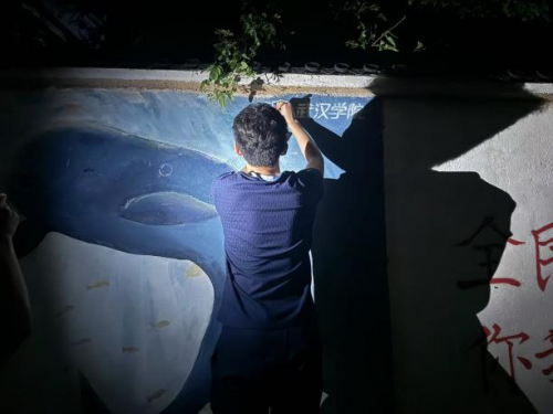 活动期间,黄州日间气温持续超 35℃,墙面温度高达 40℃以上,颜料干结问题给创作带来不小挑战。“我们多次加水以保持颜料湿润,也经常会出现上午的颜料下午干了的情况” 小队长匡慧颖回忆道。夜幕降临后,志愿者借助社区应急灯继续作业,同时应对蚊虫侵扰。令人暖心的是,社区环卫工主动提供水桶、台灯等物资支持,居民们送来的驱蚊水、绿豆汤,更成为高温中最贴心的补给。