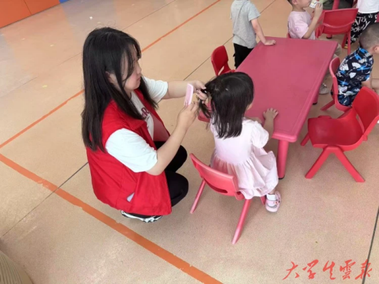 餐后的户外活动时,志愿者们牵着孩子的手在草坪上奔跑,用气球、积木与孩子们玩起角色扮演游戏,欢笑声此起彼伏。午休前,多数志愿者化身“生活小帮手”,为刚睡完午觉的小女孩们梳起可爱的辫子。