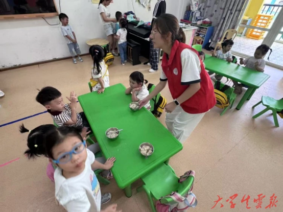 生活陪伴环节中,志愿者们的身影无处不在。每日午餐时分,他们细心为孩子们分发餐食,耐心提醒,慢慢吃