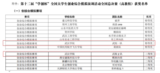 10月19日-20日,第十二届“学创杯”全国大学生创业综合模拟演训活动全国总决赛(高教组)在成都理工大学落下帷幕。beat365官方网站管理学院21级工商管理卢家旺、23级旅游管理刘子嫣和会计学院22级会计学阮靖雯同学组成的“武院一队”进入总决赛最终获得特等奖,22级供应链管理张子恒、22级物流管理高明悦和23级人力资源管理缪宇虹组成的“武院二队”进入总决赛最终获得二等奖。现场授予特等奖团队“中国大学生学创之星”称号,张勤、王慧梅获“最佳指导老师奖”。