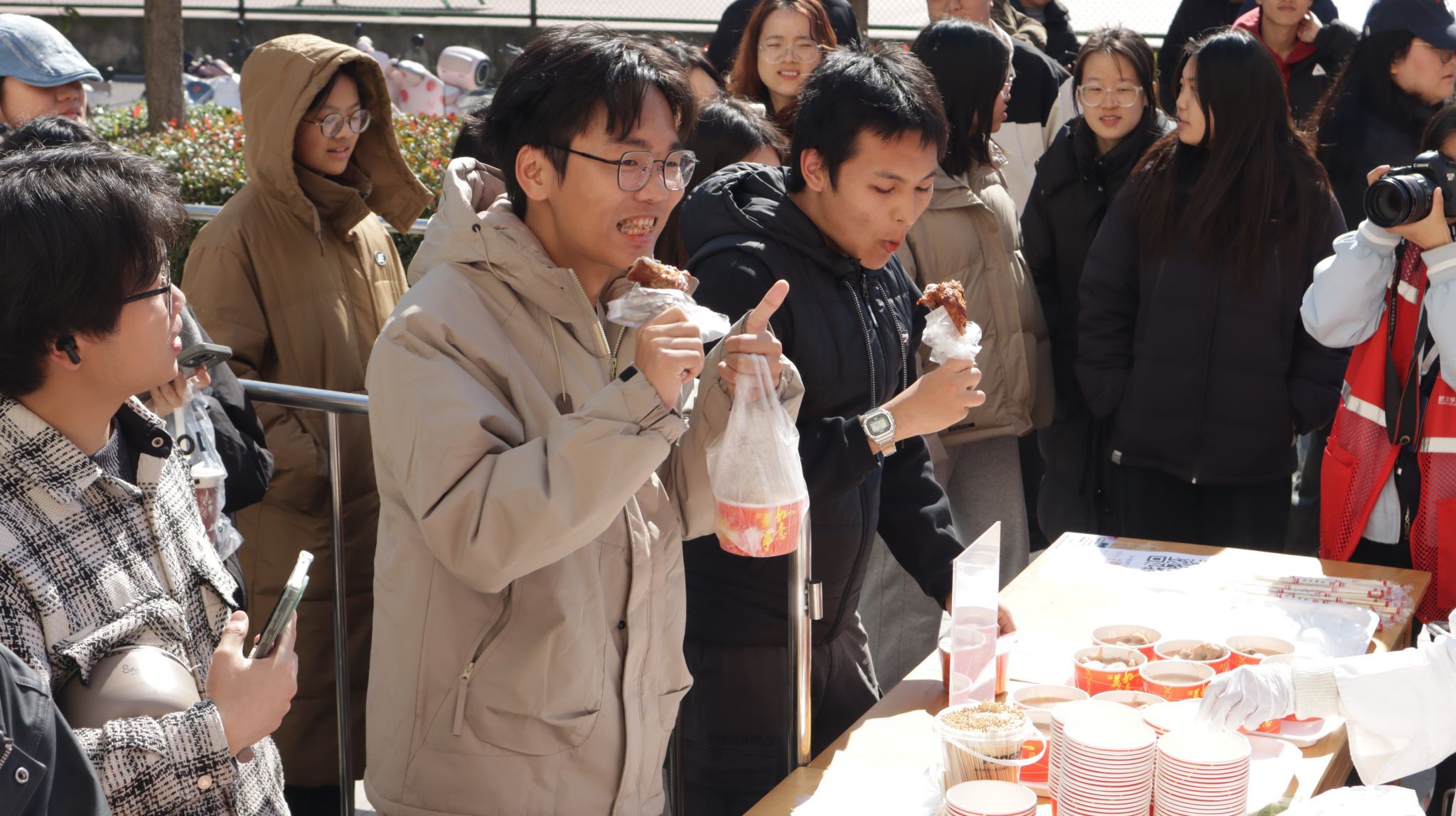 “去年没吃到,今年特意提前过来排队!”一位正在品尝烤全羊的同学兴奋地说。活动现场,香气四溢的烤全羊和温暖滋补的藕汤成为现场最受瞩目的“重磅美食”,师生手捧热腾腾的藕汤,在初冬时节感受到浓浓暖意。现场还设有趣味游戏互动区。同学们通过参与“说反话”“指东看西”等小游戏赢取抽奖与套圈机会,现场笑声不断,气氛热烈。
