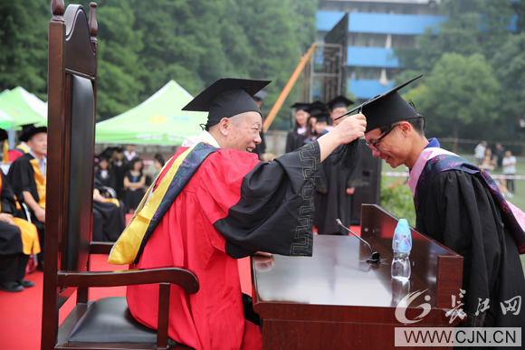 上午9点,数百名身穿黑、红两色学位服,头顶黑色流苏学位帽的毕业生依次走上主席台,台上身穿红黑两色学位服的覃有土,将毕业生帽上的流苏从右侧拨至左侧,为他们正冠拨苏。