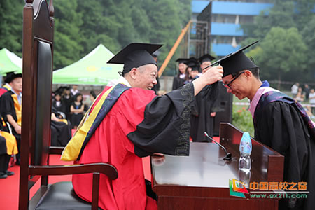 感恩环节,优秀毕业生代表为父母献花。覃有土教授宣读“关于2015年学士学位授予的决定”,授予余姣等1772名同学普通高等教育本科学士学位。各系毕业生代表分别上台,接受覃院长的“拨穗”。