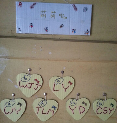 门牌一面是彩色蝴蝶结,一面是动作各异的漫画人物,分别用淡黄和淡蓝两色打底。正反两面分别写有“in”和“out”以及寝室成员姓名的缩写。据悉,这六张“萌萌哒”门牌是由421寝室的小伙伴们一起分工合作完成。蝴蝶结和动漫人物是她们一笔一笔的纯手工画出,心型的硬纸板也是用剪刀剪成。而“翻牌制度”就是外出和回来时自觉的把牌子翻到对应“out”或“in”的那一面,让其他人清楚寝室里的人员情况。