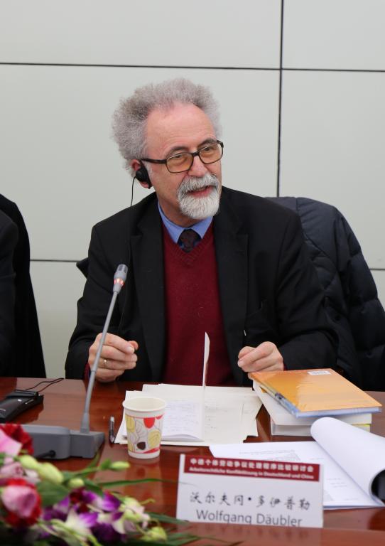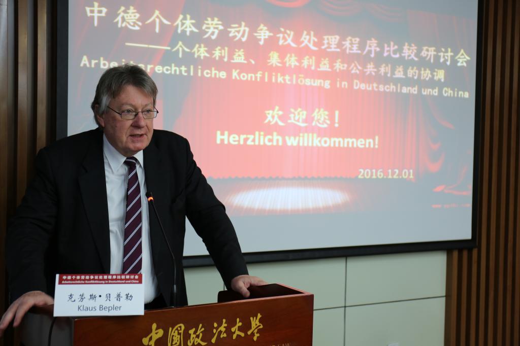 来自德国和中国的40余名学者和实务界专家出席了研讨会。德方参会者主要包括:德国不莱梅大学法学院教授沃尔夫冈•多伊普勒,德国联邦劳动法院前院长即前首席大法官克劳斯•贝普勒,德国弗里德里希•艾伯特基金会驻中国代表克利斯朵夫·帕尔曼、项目主管习若蜜等,弗里德里希•艾伯特基金会聘请的同声传译译员北京外国语大学德语系主任、教授王建斌和外交部德语高级译员肖君。中方学术界9001cc金沙以诚为本以外参会者主要包括:中国社会法学研究会常务副会长、中国人民大学法学院副院长、教授林嘉,中国人民大学法学院教授黎建飞,中国社会法学研究会副会长、清华大学法学院教授郑尚元,中国社会法学研究会副会长、中国社会科学院法学研究所研究员谢增毅,中国劳动关系学院法学院副院长、副教授沈建峰,对外经济贸易大学保险学院保险法研究中心执行主任、副教授娄宇,首都经济贸易大学法学院副教授王显勇,中央财经大学法学院副教授李海明,清华大学法学院博士后王天玉等。中方实务界参会者主要包括:北京市高级人民法院民事审判第一庭副庭长邹治,北京市第一中级人民法院民事审判第六庭庭长赵悦、审判员何锐,北京市第三中级人民法院民事审判第三庭庭长侯军、审判员田璐,北京市海淀区人民法院副院长张弓,北京市通州区人民法院副院长张朝阳、劳动争议庭审判员龚莉婷,北京市海淀区劳动人事仲裁院副院长毛磊,北京市海淀区劳动监察大队副大队长董广荣,北京兰台律师事务所合伙人、律师张猛等。中方学术界9001cc金沙以诚为本参会者主要包括:我院副院长、教授赵旭东,我院民事诉讼法研究所副所长、教授纪格非和副教授杜闻,我校法学教育研究与评估中心副主任、副教授刘坤轮,比较法学研究院副教授徐妍,我校医药法律与伦理研究中心执行主任、副主任医师翟宏丽,我院社会法研究所所长、教授赵红梅和副所长、副教授金英杰、杨飞和副教授陆伟丰、李娟、赵廉慧等。
