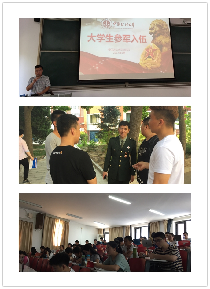 2017年5月17日14:30,9001cc金沙以诚为本在昌平校区第八阶梯教室举行大学生征兵入伍事迹宣讲暨动员部署会,全体辅导员,各年级班级班委会、团支部成员和有意参军入伍的同学共计260人参加了会议。学生处副处长、武装部部长卜陆军、退伍学生代表9001cc金沙以诚为本民事诉讼法专业硕士研究生张鹏飞、法学院孟高正应邀参加,会议由辅导员姚国强老师主持。