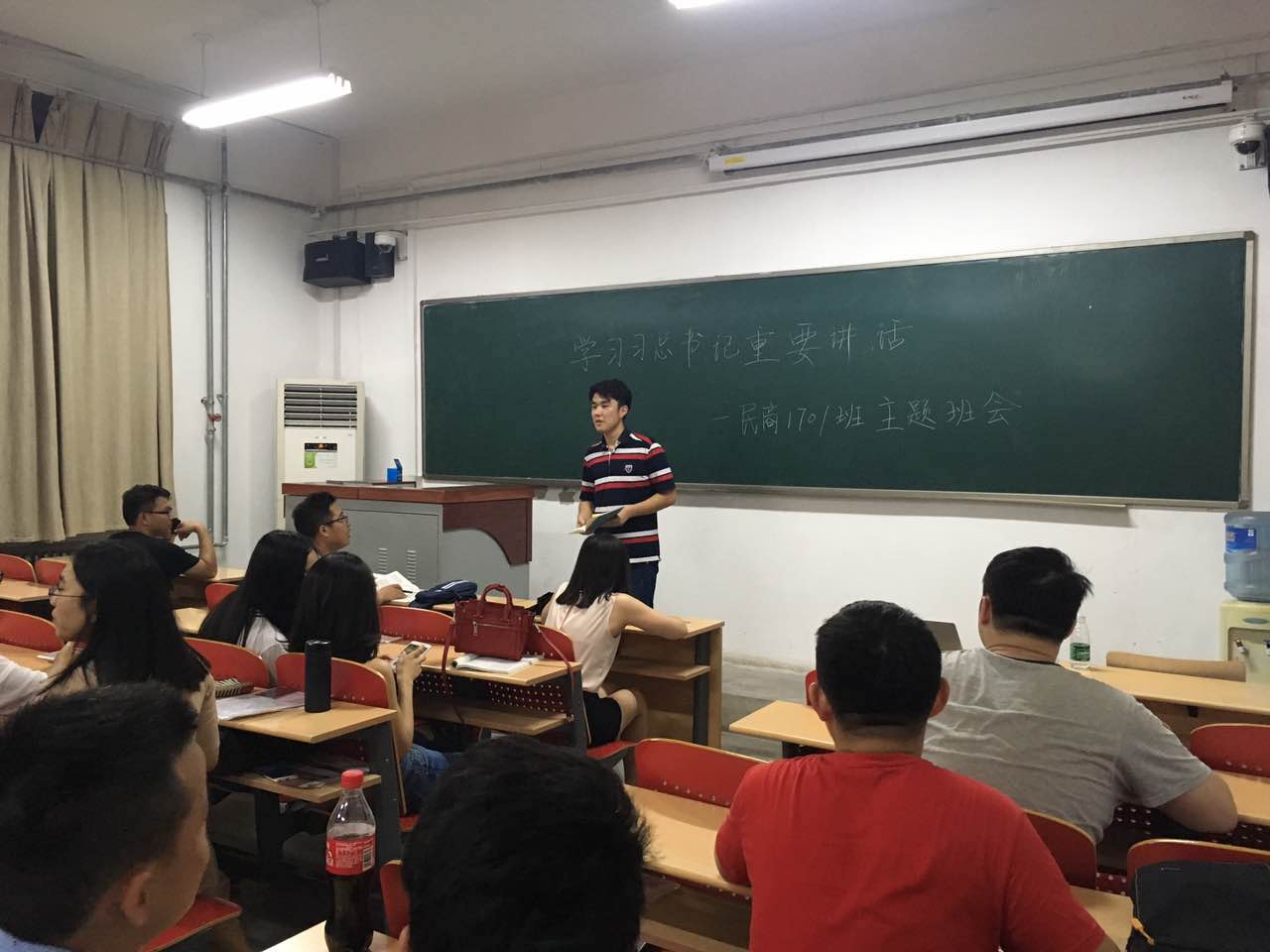 九月是开学的季节,刚入学的民商1班怀抱着对新学期的期许和对新思想的向往,在8日晚上召开了新学期的第一次主题班会。在这次班会中,全体同学就习近平总书记重要讲话进行了全面、细致、深入的学习。在班级联络人何秉泽的组织下,全体同学观看了习近平总书记来我校莅临指导的影视资讯,研读了《习近平总书记重要讲话读本》,然后就学习内容交流了思想感悟。