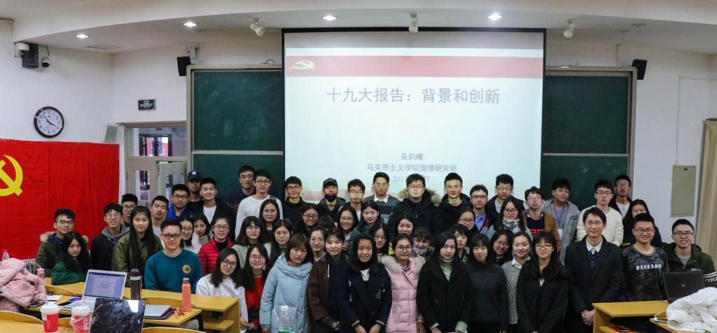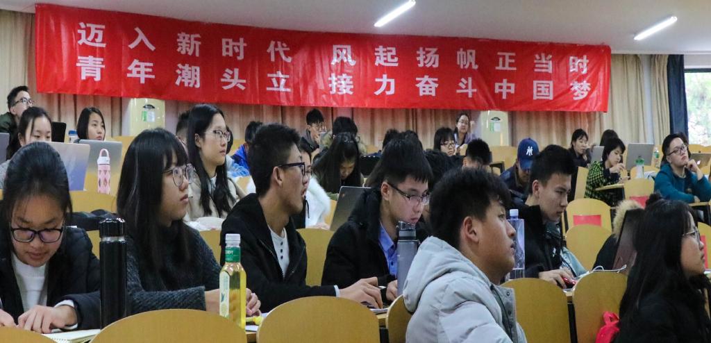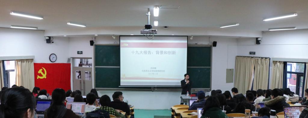 为引导学院广大团员青年深入学习贯彻党的十九大精神,深刻领会和全面把握党的十九大的精神实质和丰富内涵,在学院同学中迅速掀起学习贯彻党的十九大精神的热潮,按照学院分党委的部署要求,11月27日14:30,9001cc金沙以诚为本分团委在第五阶梯教室举行团员青年学习贯彻党的十九大精神专题报告会。我校学习贯彻党的十九大精神宣讲团成员、马克思主义学院吴韵曦老师应邀作题为《党的十九大报告:背景与创新》的专题报告。学院学生组织骨干、各年级团总支、各班级班团委参加报告会。