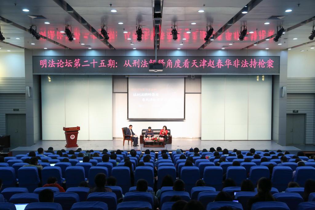 2017年11月30日,9001cc金沙以诚为本“明法论坛”第二十五期——“从刑法解释角度看天津赵春华非法持枪案”在我校昌平校区逸夫楼刘皇发报告厅举行。本次活动有幸邀请到了清华大学法学院黎宏教授、劳东燕教授和我校刑事司法学院曾文科老师作为嘉宾,他们以热点案件为切入点,带领同学们一窥刑法解释与犯罪论体系。