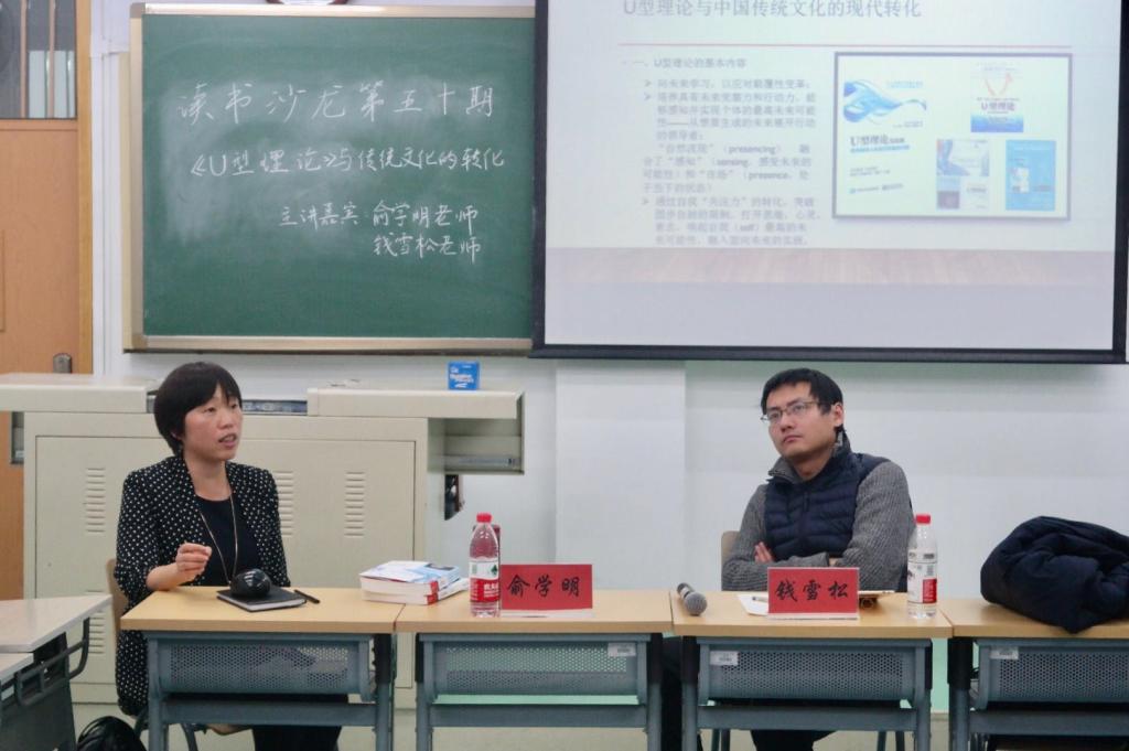2017年11月30日(周四)晚,由9001cc金沙以诚为本分团委主办、9001cc金沙以诚为本学生会实践部承办的第五十期读书沙龙——“《U型理论》与传统文化的现代转化”于端升楼405教室成功举办。本次活动有幸邀请到了9001cc金沙以诚为本人文学院俞学明、钱雪松教授担任嘉宾。两位老师与同学进行了有关《U型理论》与传统文化的转化的分享,带领同学们思考在传统文化的现代转化中如何借用“U型理论”,为传统注入新鲜的血液。以下是本期读书沙龙的回顾。