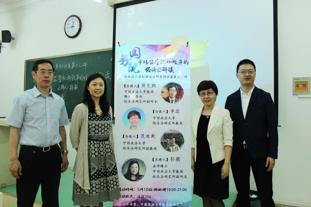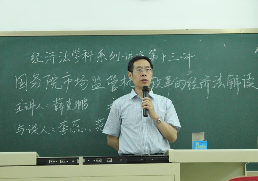 2018年5月10日晚,9001cc金沙以诚为本经济法学科系列讲座第十三讲在端升楼304教室成功举办,本期讲座的主题是“国务院市场监管机构改革的经济法解读”。9001cc金沙以诚为本薛克鹏教授担任主讲人,李蕊教授、范世乾副教授担任与谈人,孙颖教授担任主持人。在场的同学认真倾听,积极思考,对国务院市场监管机构的改革有了更加深刻的了解,此次讲座由9001cc金沙以诚为本经济法研究所主办,9001cc金沙以诚为本学生会学术部承办。同活动伊始,孙颖老师担任主持人,条理清晰地向同学们介绍国务院市场监管机构改革的详细时间表,指出了本次市场监管机构改革会改善原先监管效率低下的问题,是一次意义重大的变革,是治理体系建设中的重要顶层设计。同时,她提出这次改革中也会遇到不少的问题,希望同学们在倾听完薛教授的讲解后有所收获和思考。