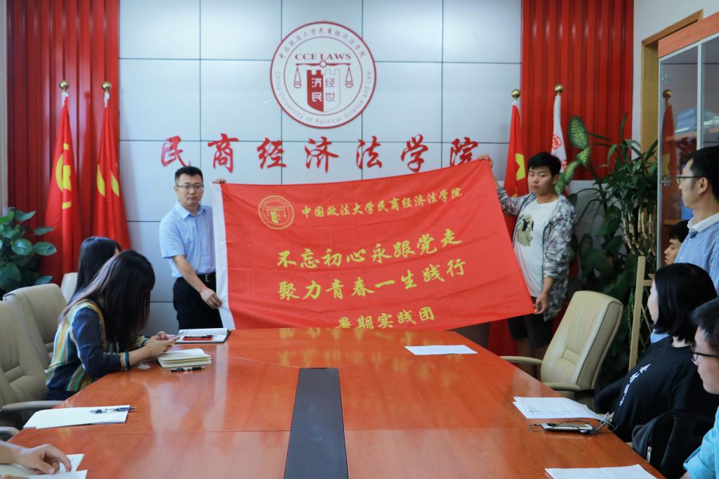 6月28日17:00,9001cc金沙以诚为本“不忘初心永跟党走 聚力青春一生践行”2018年暑期社会实践团启动授旗仪式在办公楼 B315会议室举行,9001cc金沙以诚为本党委书记王洪松出席,辅导员张葆、苑阳、陈莹蓝与实践团同学共同参加。