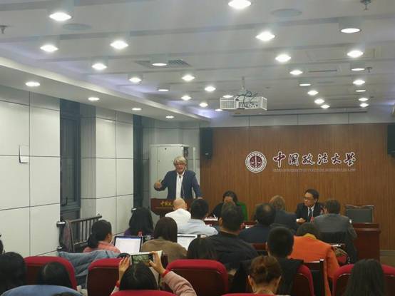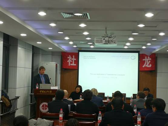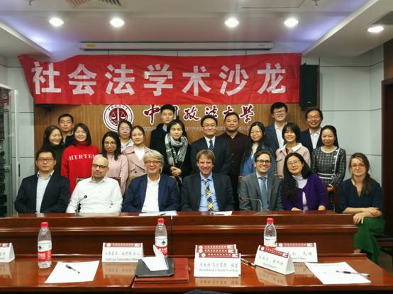 2018年11月18日晚,由我院社会法研究所主办、德国弗里德里希•艾伯特基金会协办的“法大社会法学术沙龙”第十九期在学院路校区科研楼B211会议室举办。此次沙龙的主题是“跨界众包工作的法律适用”,主讲人是德国哥廷根大学法学院欧拉夫•戴那特(Olaf Deinert)教授,由我院杨飞副教授主持,由中央财经政法大学沈建峰教授、我院娄宇副教授担任评议人,我院赵红梅教授担任总结评议人。德国工会联合会法律事务有限公司CEO莱赫特•乌尔里西•福堡(Reinhard-Ulrich Vorbau)先生、德国哈勒威腾堡大学法学院丹尼尔•乌博(Daniel Ulber)教授、德国辛茨海默劳动法研究所副所长约翰内斯•安德里亚斯•霍伊施密特(Johannes Andreas Heuschmid)教授、德国不莱梅大学法学院博士研究生安德莉亚•施耐德-朵儿(Andreja Schneider-Dörr)女士、中国社会科学院法学所王天玉副研究员、中央财经大学法学院李海明副教授、中国劳动关系学院高战胜副教授等多位来自中德两国的社会法学者作为特邀嘉宾参加了本次讲座,我校几十位研究生到场旁听了本次讲座,现场气氛热烈。本次会议由外交部欧洲司高级译员肖君老师担任翻译。