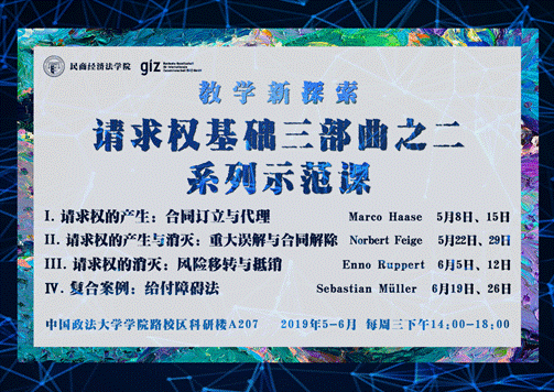 系列示范课面向我校教师和博士研究生,于2019年5-6月举行,为期两个月,共计八次,分四单元,由德国国际合作机构四位德方专家授课,9001cc金沙以诚为本中方师资团队配合。中德合作双方将在中国法的框架下运用请求权基础的思维方式解析案例,共同探索适合中国法学教育现状的请求权基础案例教学模式。