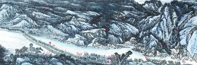 整幅作品为全景式山水画构图式,采取不同的角度分别用深远、高远、平远的构成法则,在视觉上产生不同空间变化,在色彩的运用和笔墨的手法上也是别具一格。“这副作品我认为还是不够完善,所以今年暑假我会再一次去贵州收集资料,因为画卷中的细节非常重要,包括当时老百姓的衣服都要细致地描绘出来,突出细节才可以更好的反映当时的生活水平,”虽然大家都对《长征》这幅画作赞赏有加,但是何德坤老师却表达了自己对于这幅作品最真实的看法,同时他也希望能够继续去完善这幅作品。