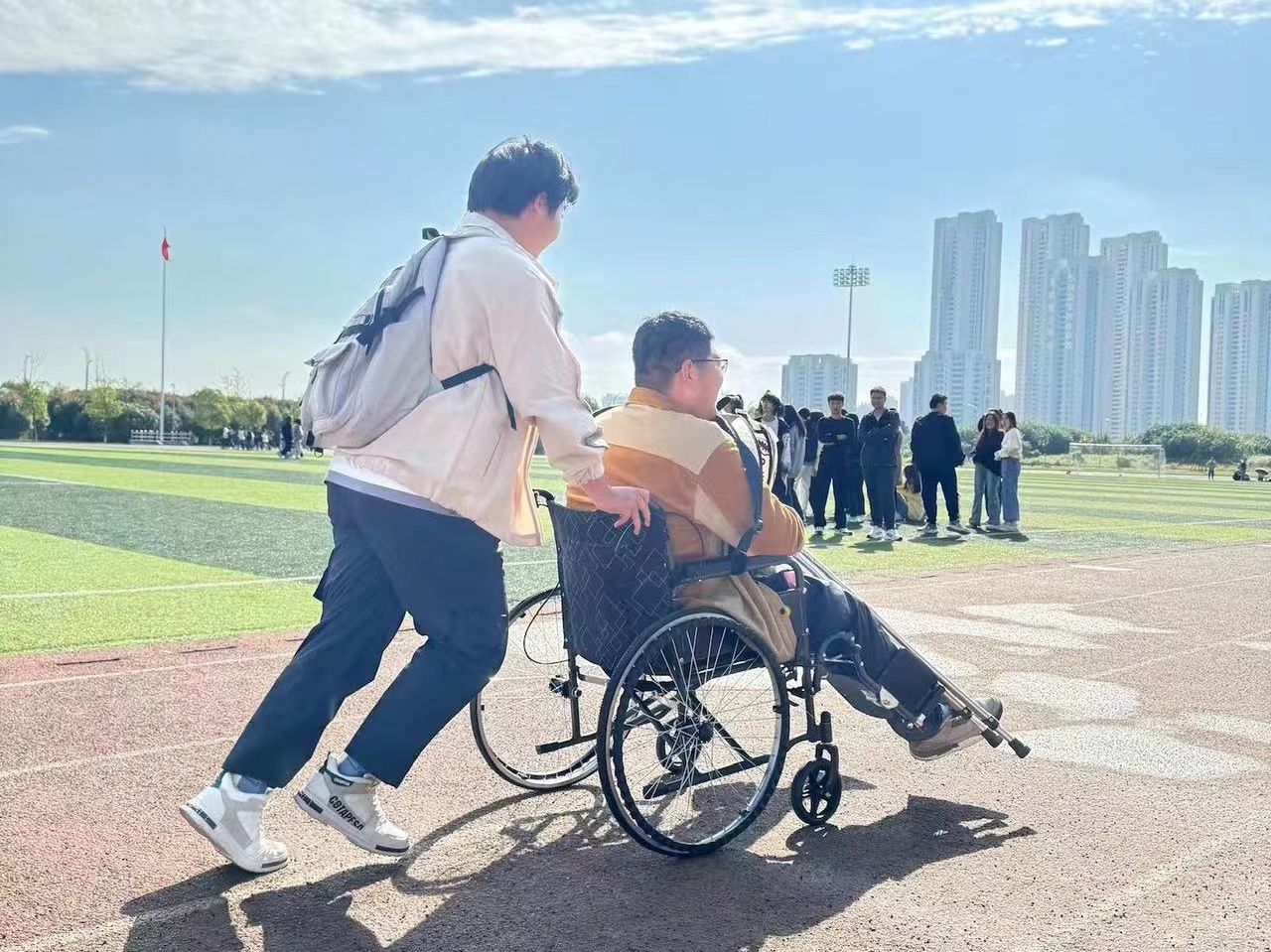 刚出院时,他需要坐轮椅,上楼梯时需要拄拐杖。隔壁宿舍的同学帮他买饭、取快递和倒垃圾。他的三名室友则充当起他的临时“保镖”,后面有人推轮椅,左前方有人拿拐杖,右前方有人背书包……他们四人形影不离地穿梭在学校里,像《西游记》里师徒四人那样面对困难不屈不挠,团结协作。辅导员每周至少一次去他宿舍嘘寒问暖。