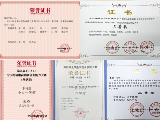 在认真准备比赛过程中,朱霓不仅巩固了专业知识,而且还补充了专业的实践方面的空白,比赛的经验让她意识到了沟通能力、识别能力、外贸能力在专业实践过程中重要性。最后她获得了丰硕的成果——朱霓的团队最后拿到了团体的一等奖,作为团队排名第一的成员,朱霓同时也拿到了个人的一等奖。朱霓还在之后参加的比赛中多次拿到了国家级奖项。她在全国商业精英挑战赛的国际贸易赛道总决赛中获得了二等奖,跨境电商直播赛道拿到了全国总决赛的三等奖等等。