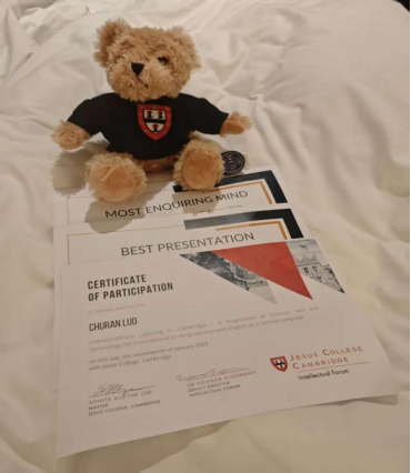 学术深耕之外,罗楚然的综合能力也很优秀。她的英语四六级成绩优异,分别取得577分和534分的好成绩。今年1月,她还参与beat365官方网站剑桥耶稣学院为期15天的访学之旅,交出了亮眼答卷。期间Dr Julian Huppert教授的课程让她印象尤为深刻,师生围绕 “电车难题” 的深度探讨,以及教授 “十年之约” 的暖心鼓励,都让她深受触动。在全英文小组结课展示环节,她与组员默契配合、从容表达,最终,所在小组斩获“BEST PRESENTATION”(最佳展示奖)。她个人也凭借敏锐的思维和自信的提问,拿下 “MOST ENQUIRING MIND”(最佳提问奖)。