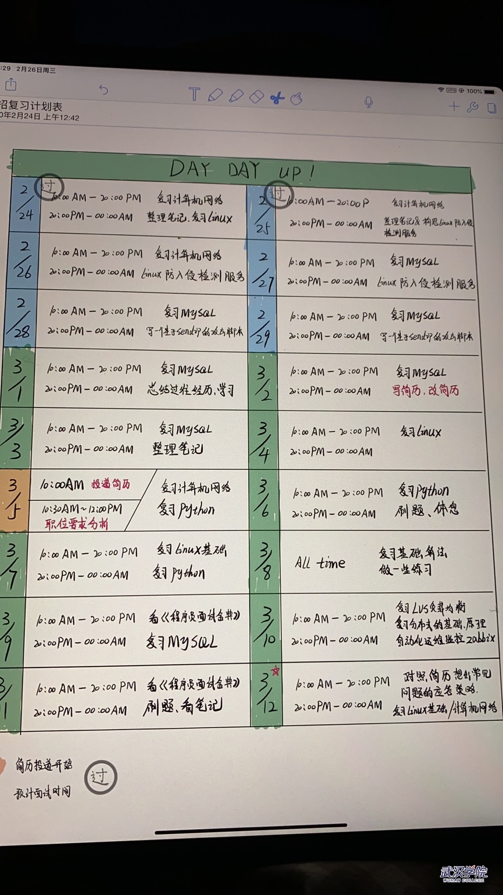 在成为实习生之时,王鸿康就在为能顺利入职腾讯做准备了。2020年1月,疫情大爆发时期,王鸿康在家隔离期间每天早上六点起床,全面复习大学所有课程,晚上总要到转钟之后才睡觉。“一开始,想到哪里就复习到哪里,后来发现不行应该有个系统的规划。”王鸿康说,“我就制作了一张复习计划表,对应的每个板块和知识点,每完成一项就打一个勾,这样才能查缺补漏,复习全面。在兼顾实习和学业的那段时光里,王鸿康最晚在凌晨四点才睡觉。“就睡了五个小时吧,九点钟我就又起来继续学习。”