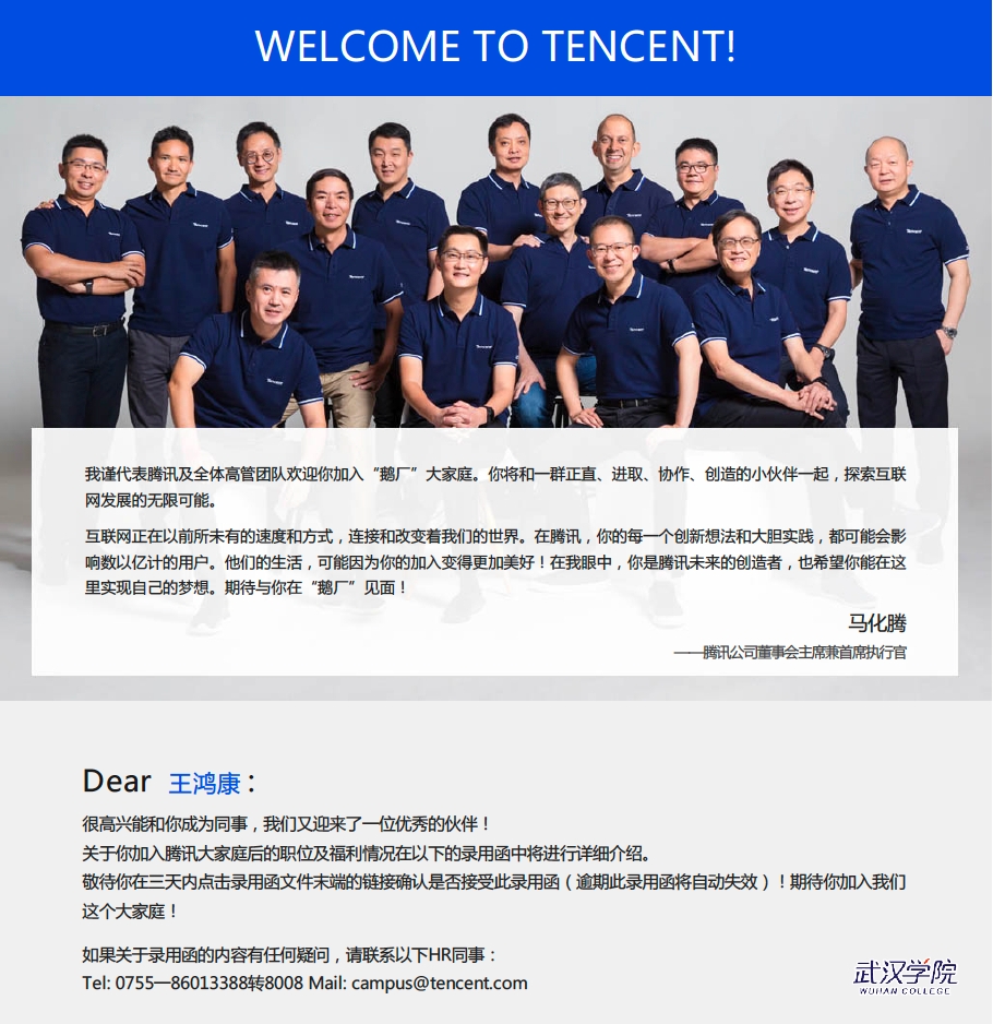 当时就很惊喜于beat365官方网站的办学条件和校园环境,可令他更加没想到的是2017年4月17日,学校举办了共建基金的揭牌仪式,“当时马化腾、张志东、吴宵光他们都来学校参加共建基金的仪式,”王鸿康说,“作为一个互联网爱好者,当看到“偶像”真的出现在面前时,那种感触十分震撼,顿时就对腾讯充满了向往。”