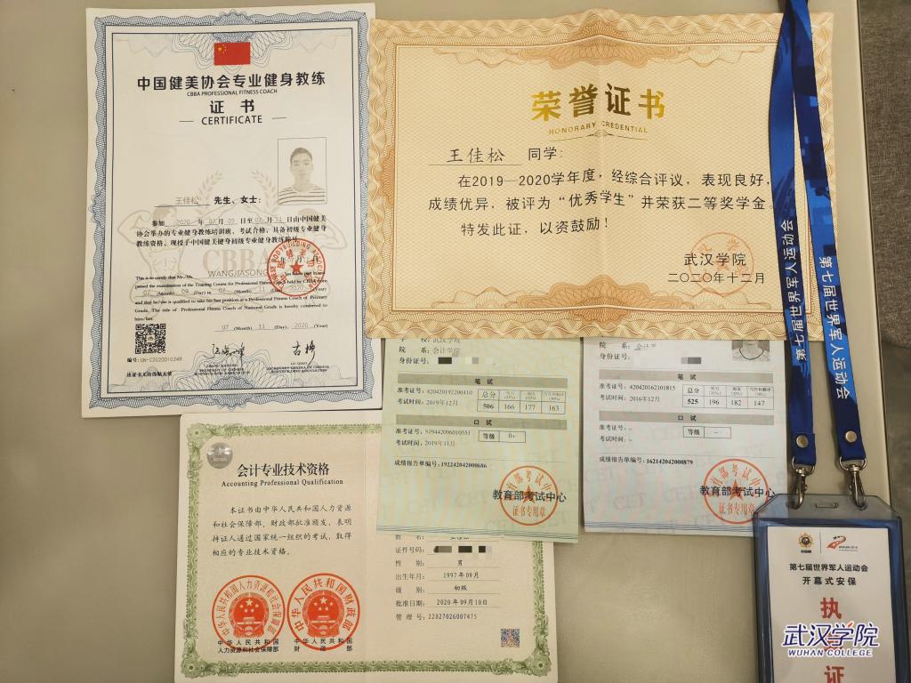 2019年9月,王佳松退伍复学。因为自身的学习基础本身就不是很好,再加上部队两年的学习空档期,回归校园对王佳松来说又是一次重塑自我的历程。不过有部队的经历,学习的苦对他来说已经不算什么,他信心满满的应对一切困难,不仅积极参加社会实践,参与了军运会开闭幕式期间的安保执勤,而且每天都起早贪黑弥补自己落下的课程,甚至在学习高级财务会计这一课程的时候,还在网上搜索会计学原理的课程补基础,最终本科后两年的GPA达到3.5左右,也第一次获得了学校的奖学金。2019年12月顺利通过英语六级考试,在备战考研期间通过自学获得了初级会计职称,还考取了初级健身教练的证书。“苦心人,天不负”,回学校以后的所有考试他都顺利通关。