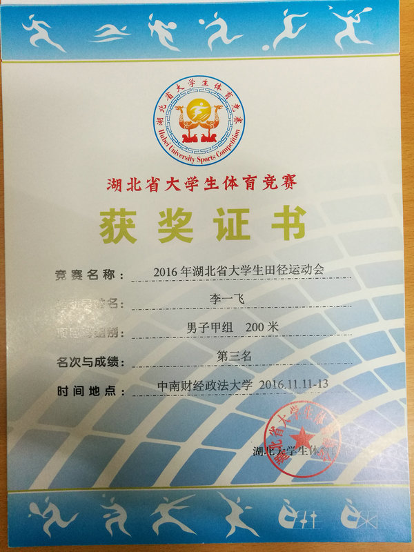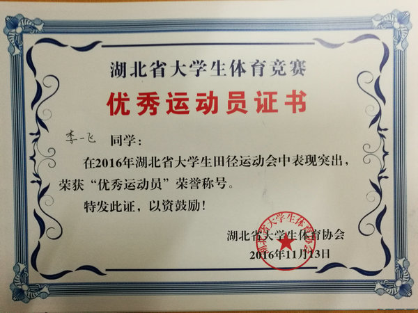 据李一飞介绍,国家二级运动员评判有着严格的标准,100米国家二级运动员标准为电子计时11″74,200米国家二级运动员标准为电子计时23″84,要在比赛现场达到这个标准更是难上加难,而李一飞在2016年湖北省大学生田径运动会上100米、200米两个项目都超过了标准。