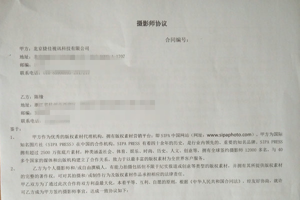 注:合同甲方是优秀的版权素材代理机构,拥有版权素材营销平台。国际知名图片社(Sip a press)在中国的合作机构。即Sip a中国网站(网址),SIPA PRESS有着四十余年的历史,是行业内领先的,重要知名品牌。拥有超过2500万张底片素材,种类涵盖社会、体育、娱乐、时尚、历史、人文、创意等,拥有全球签约摄影师12000多名,与40多个国家的媒体和出版机构建立了合作关系,致力于以最丰富的版权素材为全世界客户服务。