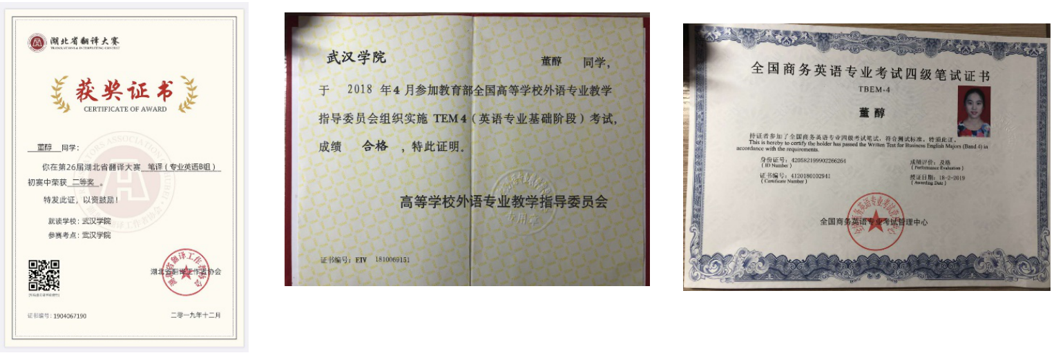 董醇,beat365官方网站外国语学院商务英语2016级学生,现已被中南财经政法大学外国语学院英语通用笔译专业拟录取。以“那些看似不起波澜的日复一日,会在某天让你看到坚持的意义”为座右铭的她,始终坚持积跬步至千里,积小流成江海的信条。本科在校期间,她先后取得了英语六级、英语专四、商务英语专四、剑桥商务英语中级、三级笔译、计算机二级、教师资格证等证书,荣获了中西部翻译大赛二等奖、湖北省翻译大赛初赛二等奖决赛三等奖、希望之星演讲比赛市二等奖等奖项,并被评为2020届优秀毕业生。