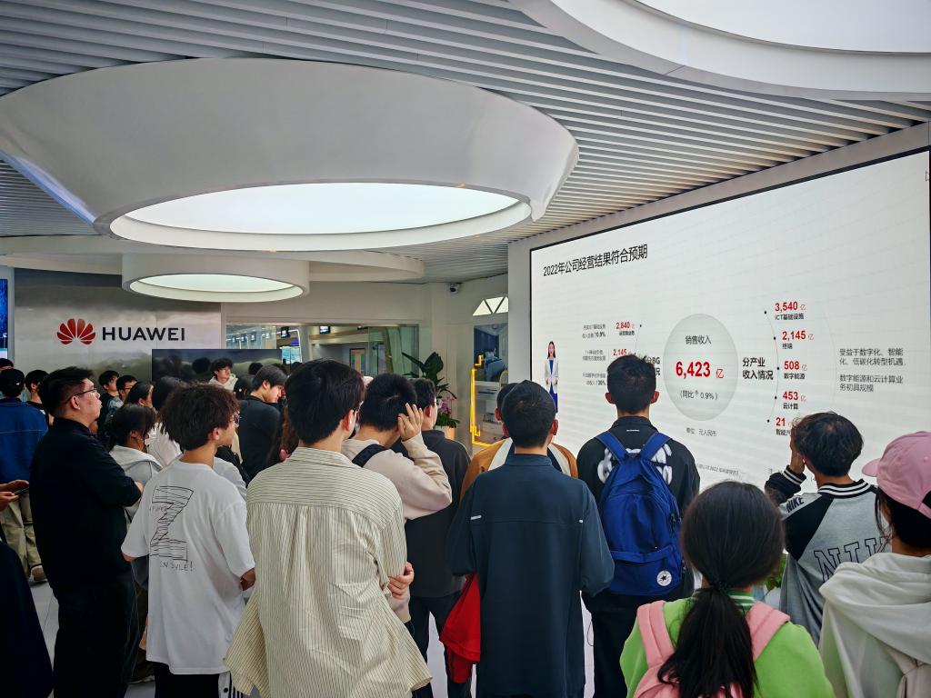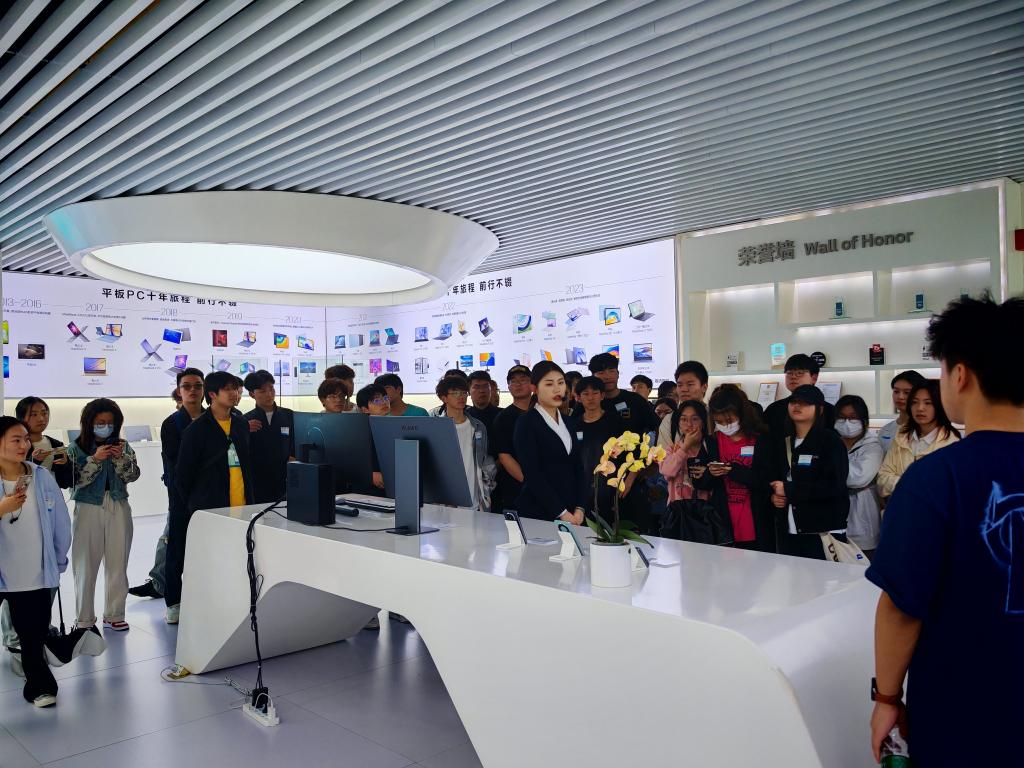 在接待员的带领下,学生们参观了武研所展览厅,展厅中陈列着华为公司的各种产品,从最新的小折叠旗舰P60 Pocket到“国礼”Mate X5,从平板到一体式电脑,各种高科技终端让同学们大饱眼福,这些终端还可以现场上手把玩,大家玩得不亦乐乎;除了终端之外,还有华为的一些技术产品也进行了很多介绍,比如华为云、华为光网等,让同学们真正地了解到行业最前沿的发展状况。