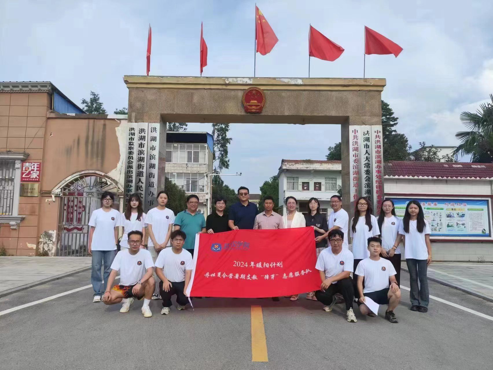 经历两个小时的车程,“律芽”志愿服务队抵达洪湖市。滨湖街道党工委副书记李德义、组织委员徐琴及共青团干部叶梓怡等一行热情接待了此次支教活动的师生们。