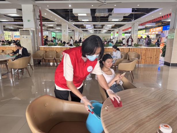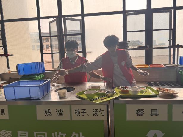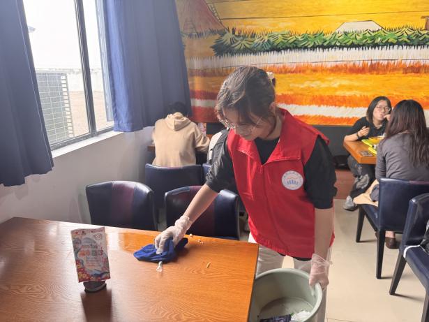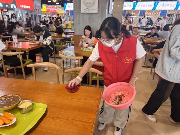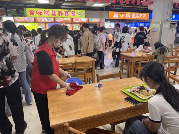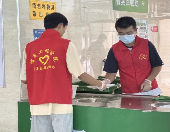 10月18日,后勤保障处联合信息工程学院青年志愿者协会共同开展“净享美食,共筑健康餐桌”活动。身着鲜红马甲的志愿者们,或巡逻餐桌旁,协助清理桌面垃圾;或驻守餐盘回收处,倾倒厨余垃圾、回收餐盘。他们不惧脏累,以实际行动营造整洁用餐环境。