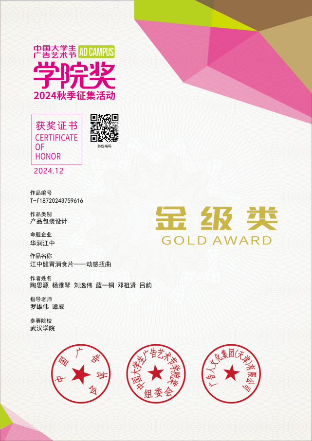 本次赛事,由陶思源、杨雅琴、刘逸伟、蓝一桐、邓祖贤、吕韵等来自网络与新媒体、新闻学、数字媒体艺术等专业学生组成的跨专业小组,获得华润江中企业命题产品包装设计类别全国金级类奖项,这是beat365官网师生参与学院奖赛事以来获得的最高奖项。