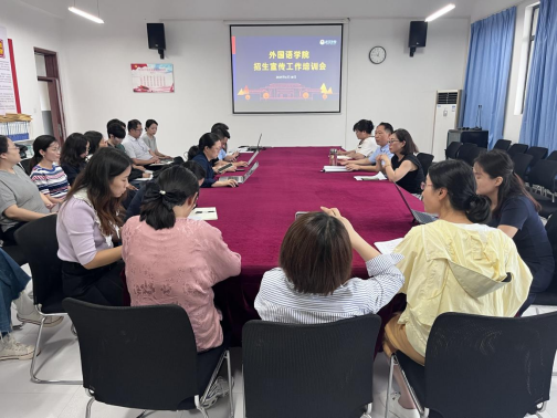 6月10日,外国语学院在学院253会议室召开招生宣传工作培训会。会议由外国语学院院长陈金平主持,今年参与高招咨询会、区域招生、校园开放日、省外招生、招生直播、电话咨询、QQ群招生咨询等7个招生工作小组的32名招生骨干教师参加培训。