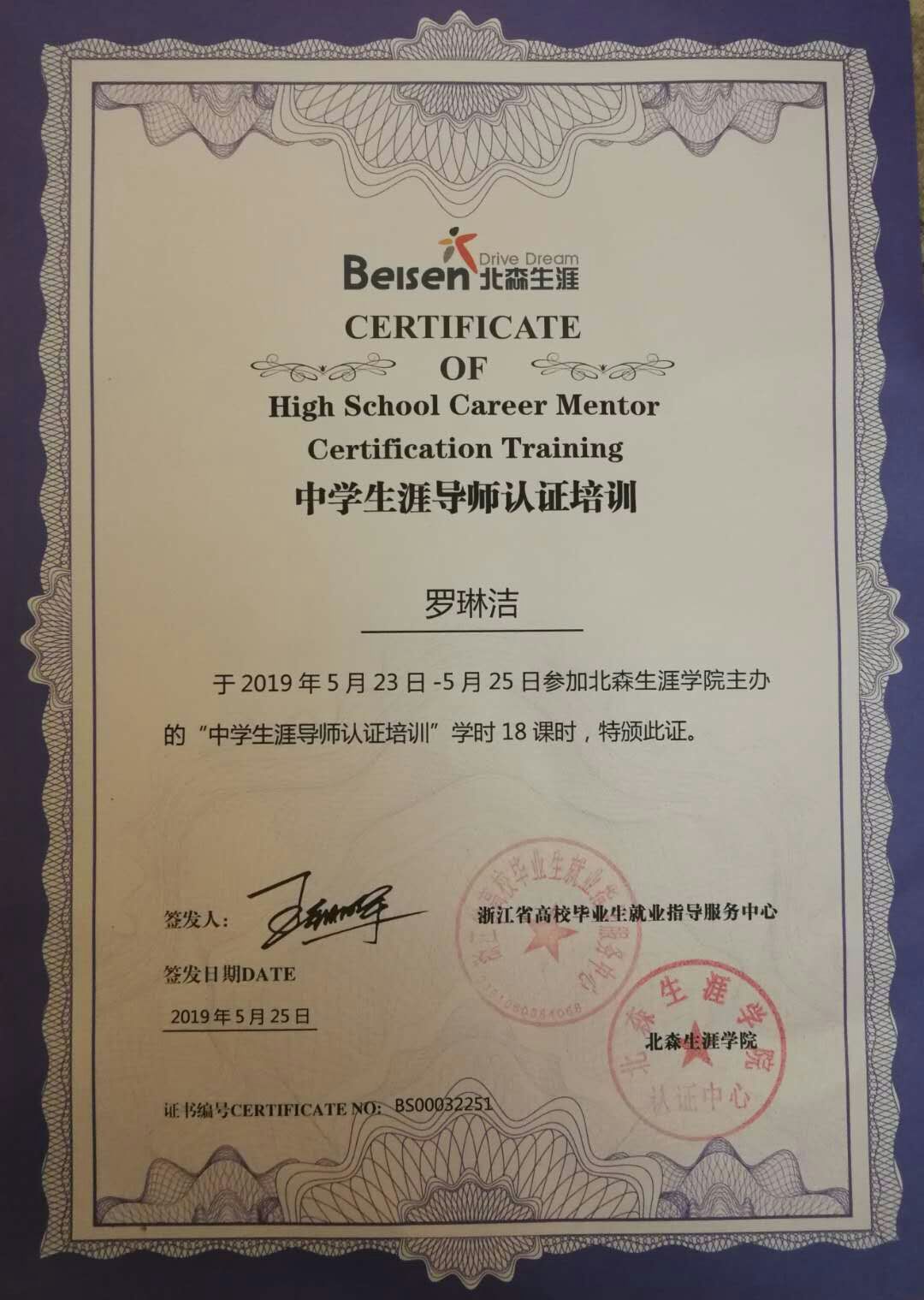 此次培训是为了进一步加强高校职业生涯规划师对接高中生涯的能力,为大学老师在新高考改革后提供更多的指导方法,利用高中生涯知识,更好地开展招生与就业工作,指导学生和家长科学选科,填报志愿。罗老师通过三天紧张的学习,深入了解高中学生选科、选专业、选学校的实际需求,对各地新高考政策落实情况进行了研究分析,充分了解生源地学生的实际情况,致力于帮助学生发展天赋潜力、培养核心竞争力,科学填报志愿等,并通过考核获得了浙江省教育厅认证“HCT高校生涯导师”资质。