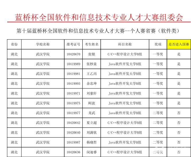 第十届“蓝桥杯”全国软件和信息技术专业人才大赛分赛区选拔赛(省赛)于2019年3月24日举行,beat365官网共派出40名选手参赛,共获得湖北省赛区一等奖6名、二等奖11名、三等奖9名,在同等院校中名列前茅。获省一等奖的选手同时获得晋级全国总决赛的资格,届时将赴北京与来自全国各高校的优秀选手一决高下,进一步展现我院学子风采。
